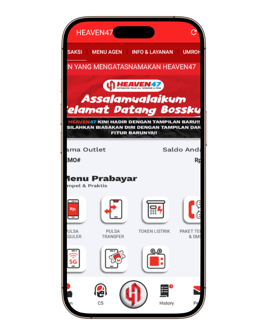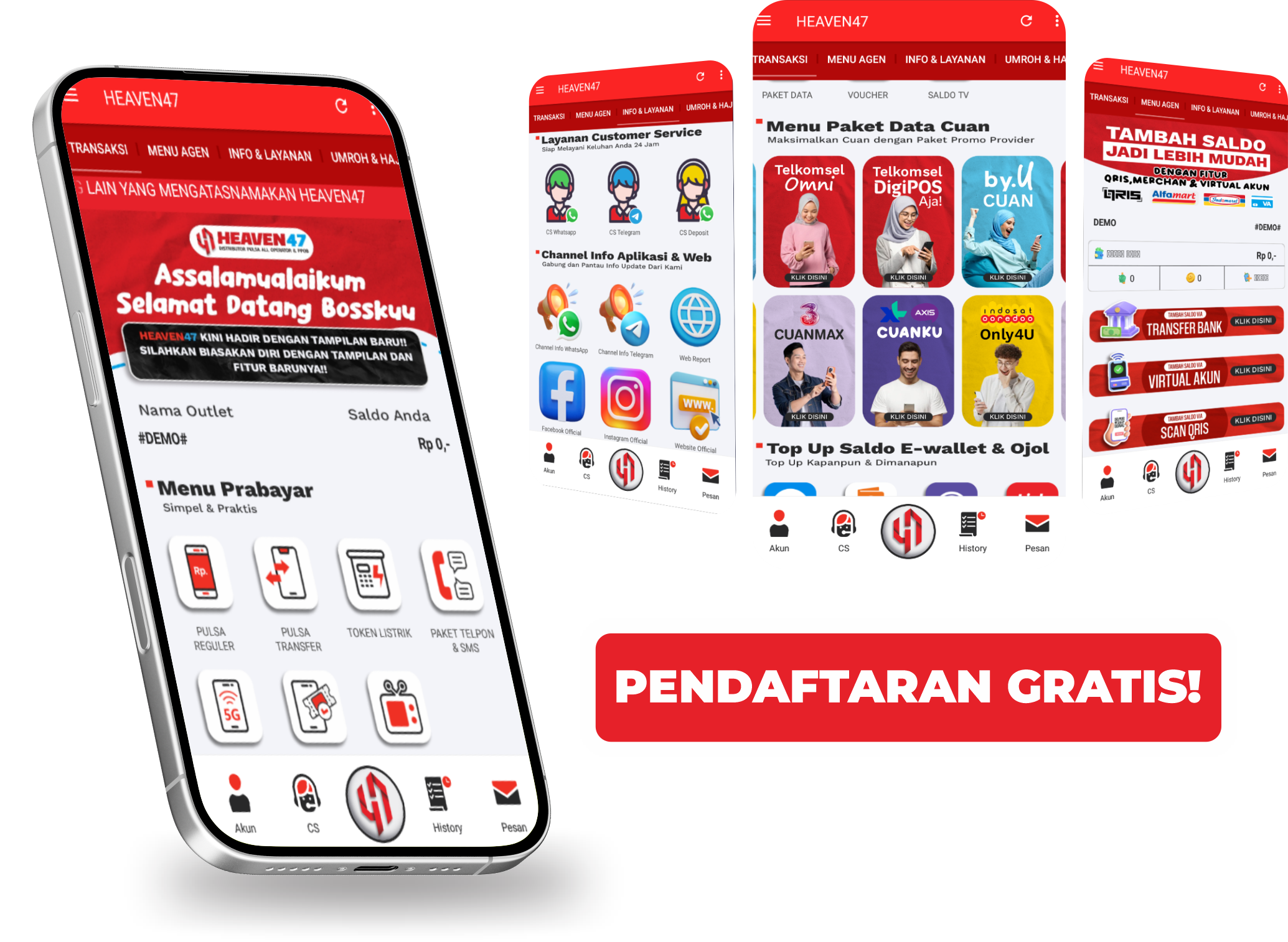 HEAVEN47 hadir sebagai solusi untuk bisnis konter kamu dengan menyediakan berbagai produk digital, mulai dari isi Pulsa dan Paket Data, Aktivasi Voucher, Token Listrik, Bayar tagihan PLN, PDAM, BPJS, dll, Top Up E-Wallet dan Transfer ke semua Bank, Top Up Game Online, dan masih banyak produk digital lainnya.