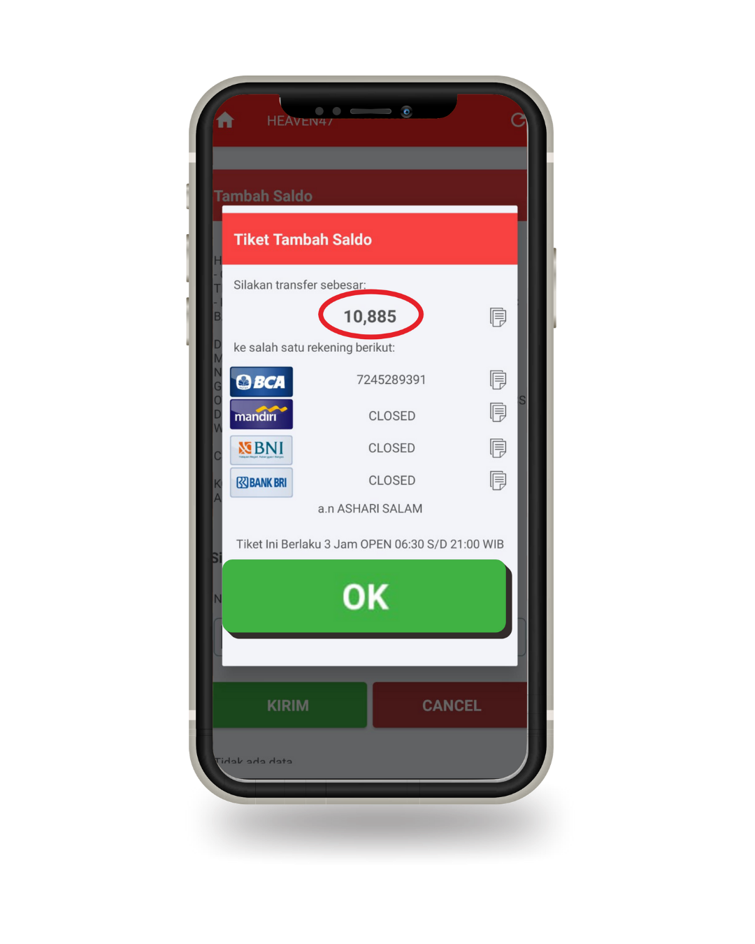 Selanjutnya transfer sesuai angka yang muncul seperti yang dilingkari. Transfer ke salah satu rekening yang tertera, jangan transfer ke rekening yang ada keterangan close atau gangguan